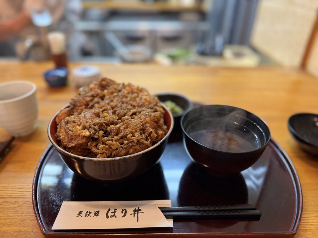 店主が揚げた天ぷらを食べると想像するとワクワクします。上がると裏に渡して程なく、丼ぶりとお味噌汁が出てきました。立派な佇まい。